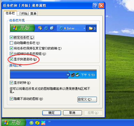 在“任务栏和开始菜单属性”对话框中找到“任务栏外观”将下面的“显示快速启动”的复选框选中,点击“确定”后退出。